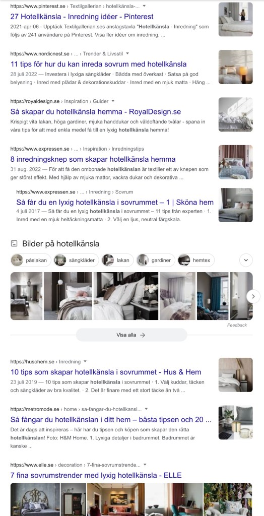 ”Ett ord som saknats i nyords-listan under flera år är ”hotellkänsla”. Det har använts för att marknadsföra konsumtion av allt från gardiner, kuddar, doftljus och tvål för 800 kronor. Allt du kan köpa till hemmet har gått att sälja med hotellkänsla.”