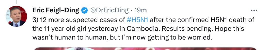 18.00 idag: ”After death of girl yesterday, 12 more detected with H5N1 bird flu in Cambodia.”