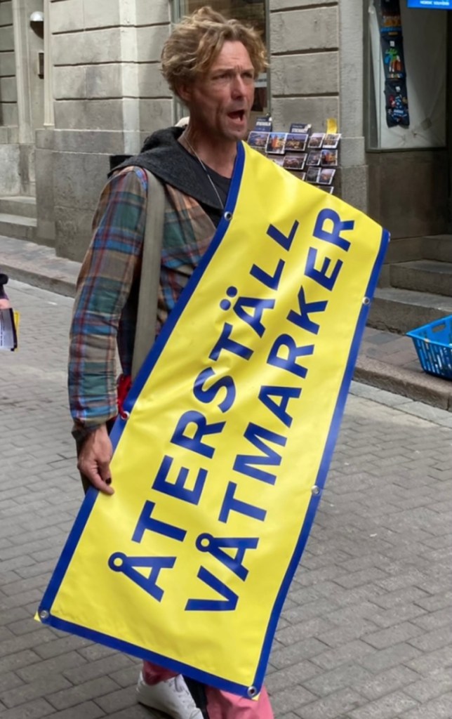 Men ingen skall inbilla sig att våtmarkerna vinner på att halvgalna aktivister rusar upp på landets scener, bärande plakat som det på fotot: