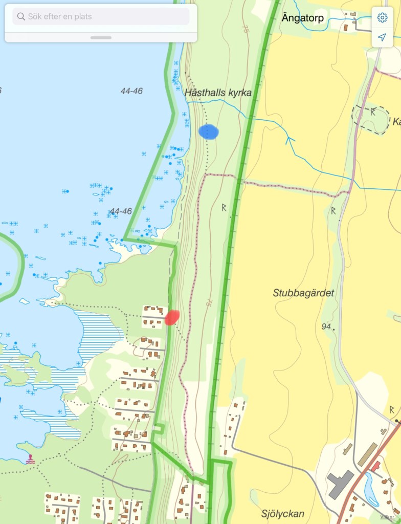 Blå markering visar var vi mötte cyklisterna. Röd den grind där de tog sig in.