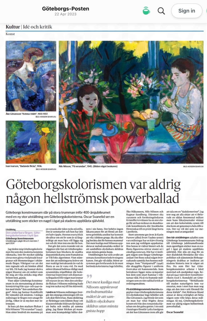 Göteborgskolorismen var sannerligen ingen hellströmsk powerballad Den här utställningen måste vi bara se. Men det är ingen brådska. Utställningen pågår till den 7:e april 2024. Dela det här: Dela på X (Öppnas i ett nytt fönster) X Dela på Facebook (Öppnas i ett nytt fönster) Facebook Gilla Laddar in … Relaterade
