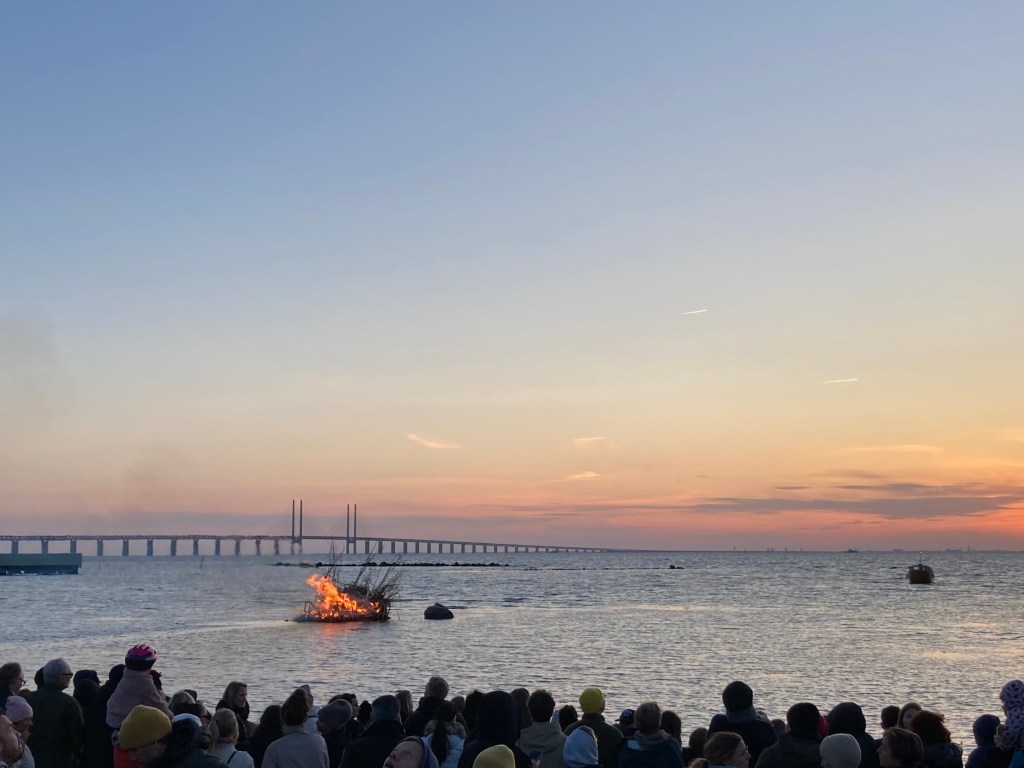 Kylslaget Valborgsmässofirande vid Sibbarpstranden. Den uppmärksamme noterar ett krigsfartyg vid horisonten på det andra fotot, ett fartyg som är på väg ut ur Östersjön, påminnande oss om att fredens hav blott är en chimär.