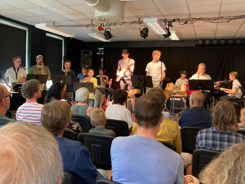 ”Göta Petter! Hur skall jag klara av det här”, sa Isak (som satt i mitt knä) när ett av banden i Kulturskolan på HTS skulle spela. Men när det var slut applåderade faktiskt Isak. Och inte undra på det. På saxofon (till vänster i bild) framträdde Simon, och det med stor skicklighet, precis som alla andra bandmedlemmar.