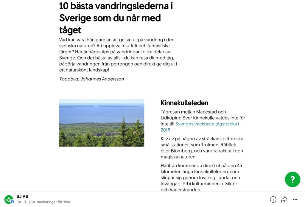 10 bra vandringsleder du kan nå med tåg Kul att både Kinnekulleleden och Hovdalaleden finns med! https://www.sj.se/sv/reseinfo/reseinspiration/vandringsleder-sverige.html?utm_source=facebook&utm_medium=paidsocial&utm_campaign=engagerande+sommar&fbclid=IwAR3jmqdomIoupatfA6RCEtfTxdrg2v2sA-JzHEPd1ulYm7HJ1Rs9l4H50z8_aem_th_ARkGybF22toTrvlN7JQALrUaz-52y2pOHFIupQurNSUVoqR1vRHc2TiWcuyr2msUocods0U6T-I-O_ilNLUyLh4K Dela det här: Dela på X (Öppnas i ett nytt fönster) X Dela på Facebook (Öppnas i ett nytt fönster) Facebook Gilla Laddar in … Relaterade