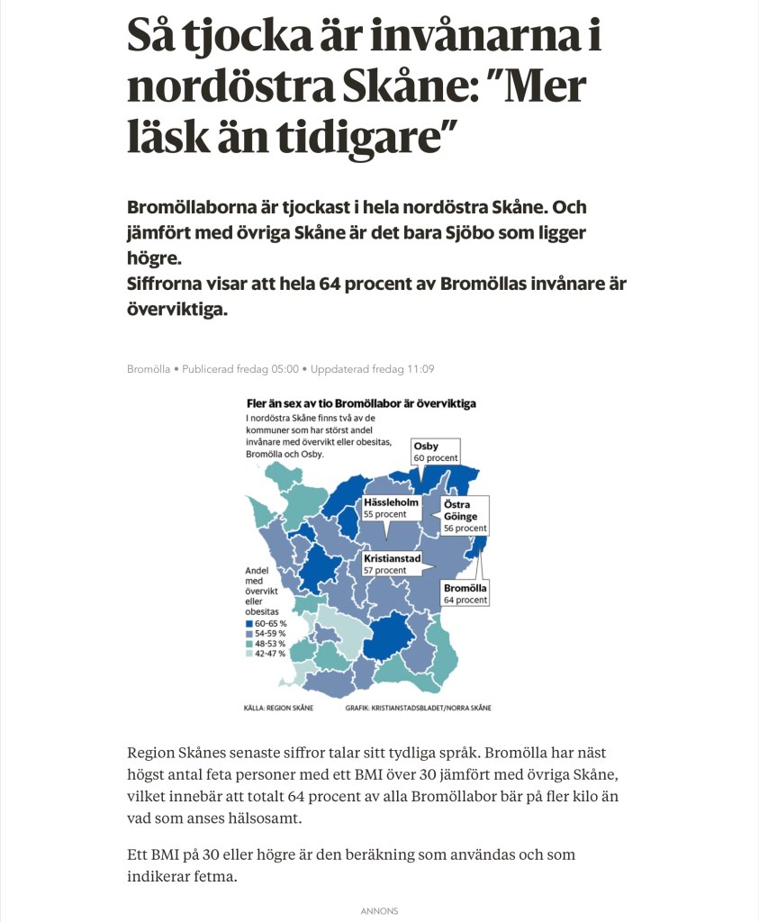 Norra Skåne hade igår en artikel om fetman i den nordöstra delen av landskapet. I Bromölla är 2 av 3 invånare feta. De behöver nog lyssna på podden.