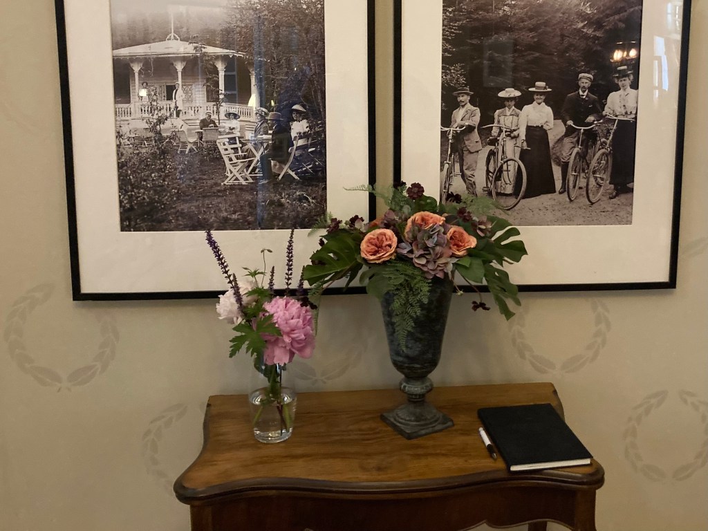 På fotot i bakgrunden (det med automobilen) kan man skymta Gustaf V och hans stränga blick när han anländer till Kurorten. ”Har de koll på brandskyddet”, tycks majestätet undra