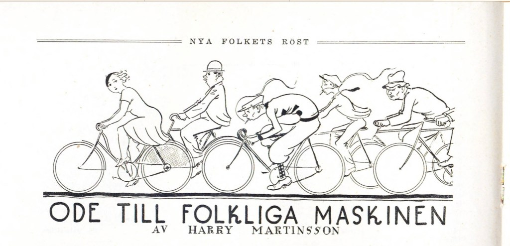 I flödet av dikter och prosastycken från Harry Martinson under 1931 fanns ”Ode till folkliga maskinen”. Den publicerades i Tidevarvet till midsommar och var en hyllningsdikt till cykeln, men samtidigt också ett angrepp på motortrafiken och den moderna tidens hets.