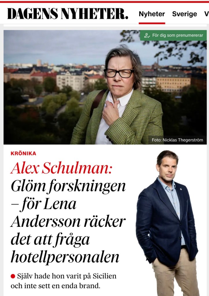 Och Lena Andersson har kommit ut som klimatförnekare, på ledarplats i SvD, något som har fått Alex Schulmann på DN att ilskna till: