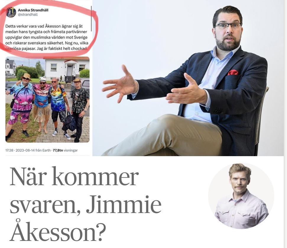 ”Detta verkar vara vad Åkesson ägnar sig åt medan hans tyngsta och främsta partivänner uppviglar den muslimska världen mot Sverige och riskerar svenskars säkerhet. Nog nu, vilka oseriösa pajasar. Jag är faktiskt helt chockad.”
