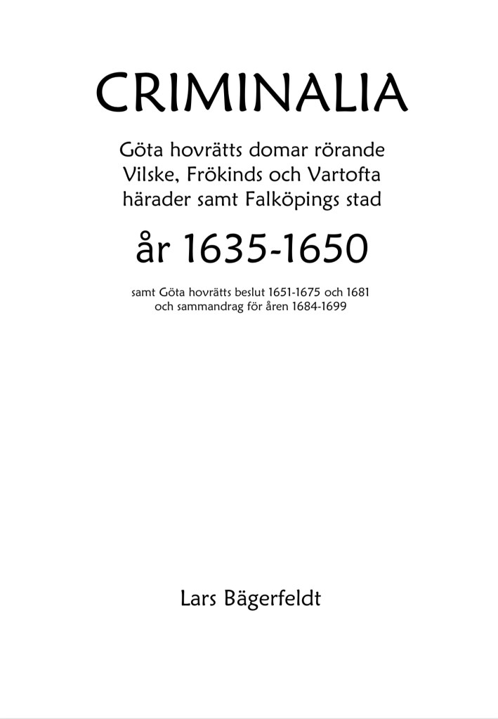 alla rättsfall som berör mord, dråp och dödsdomar, övriga mål som behandlades av Göta hovrätt, dock med undantag av mål som enbart berör hor och löskaläge, tiden fram till år 1650, såvida Bägerfeldt inte behandlat dem tidigare, i häradena Frökind, Vartofta och Vilske samt Falköpings stad.
