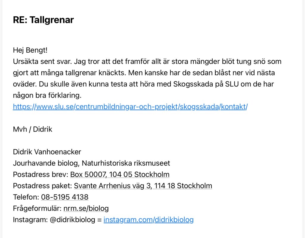 Jourhavande biolog om det stora antalet knäckta tallgrenar Screenshot Dela det här: Klicka för att dela på X (Öppnas i ett nytt fönster) X Klicka för att dela på Facebook (Öppnas i ett nytt fönster) Facebook Gilla Laddar in … Relaterade