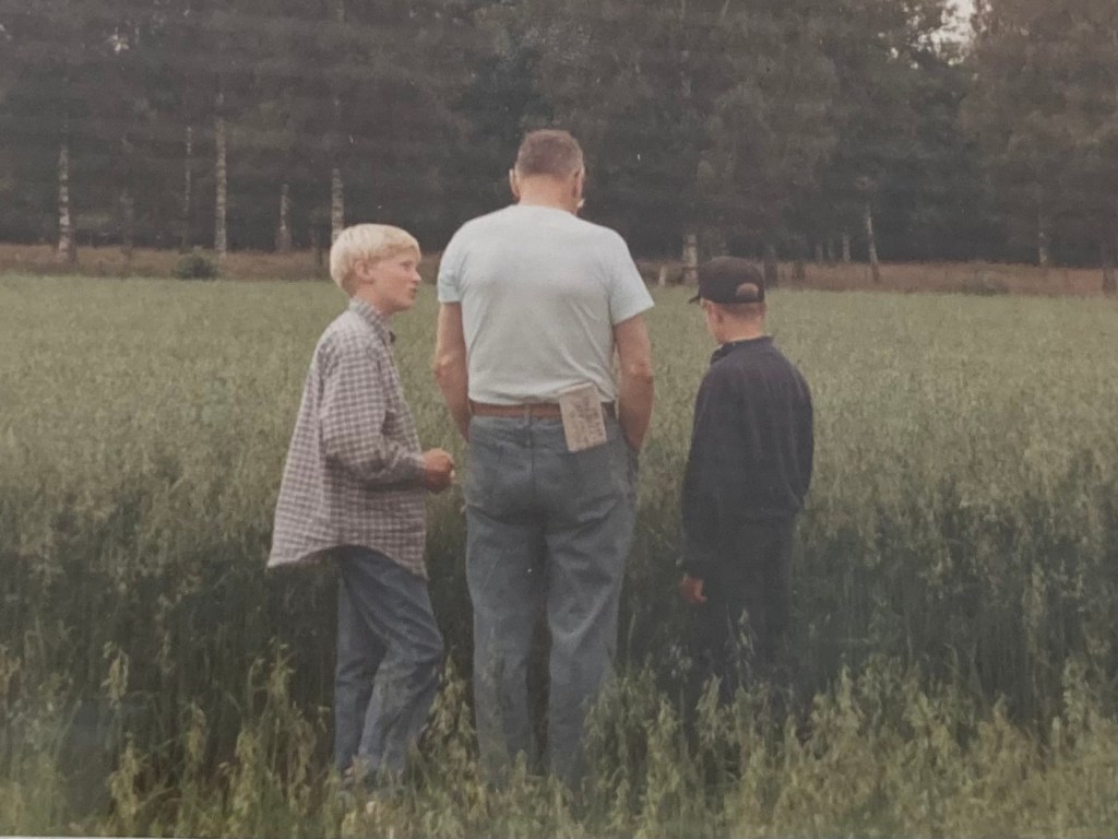 Våra söner och min morbror Nils inspekterar en havreåker. I bakgrunden skymtar barndomens hage, den hage där påskeldar tändes – med fotogen.