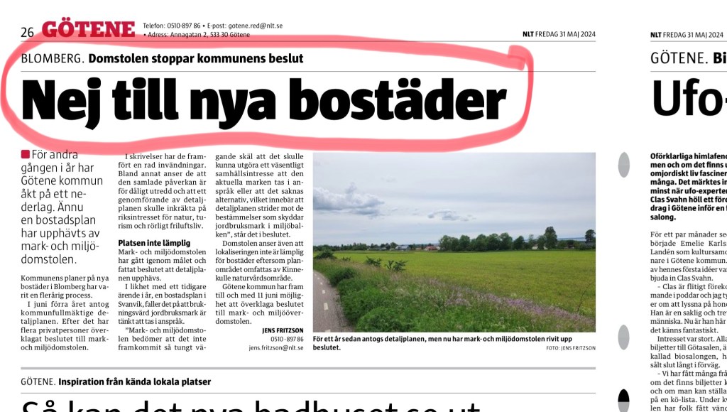 Den andra nyheten handlar Àven den om ett domstolsbeslut. Götene kommuns beslut att ta i ansprÄk jordbruksmark för nybyggnation har upphÀvts. Den vackra naturen ovan Blombergs stationssamhÀlle Àr rÀddad.