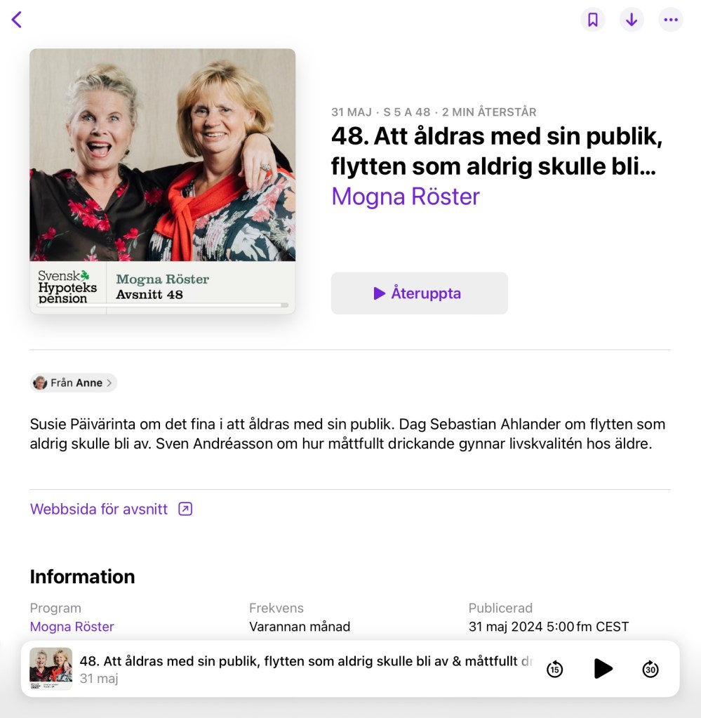I det här avsnittet av Mogna röster (som jag tipsats om av Anne) får vi bl.a. lära oss vikten av att värna djur, klimat och natur, vi får stifta bekantskap med sonen till Sveriges Radios USA-korrespondent på 1960-talet, Björn Ahlander (vem minns inte honom!!) – sonen Dag Sebastian (författare och diplomat) döstädar här inför en flytt och gör sig av med massor av böcker (som ingen visar sig vilja ha) och vi får även veta att gammalt folk dricker mer och mer, ungdomar gör tvärtom. Problemet är att ju äldre man blir, desto torrare blir innanmätet. Det innebär att alkoholen inte späds ut på samma sätt i kroppen. Skadorna på organen (inklusive hjärnan) blir därmed betydligt större när gamlingarna ägnar sig åt att förtära innehållet i de vinboxar och annat alkoholhaltigt elände de har släpat hem!! Inte särskilt smart, kan tyckas.