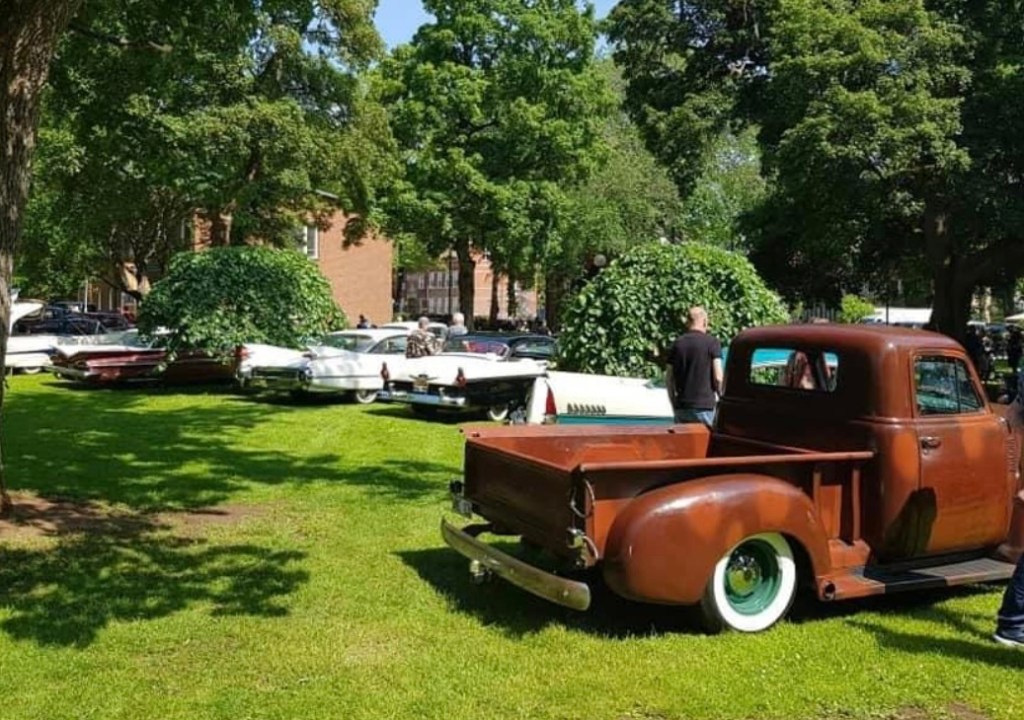 I förgrunden ser vi det som tycks vara svenska folkets favoritobjekt, dvs gamla amerikanska bilar.