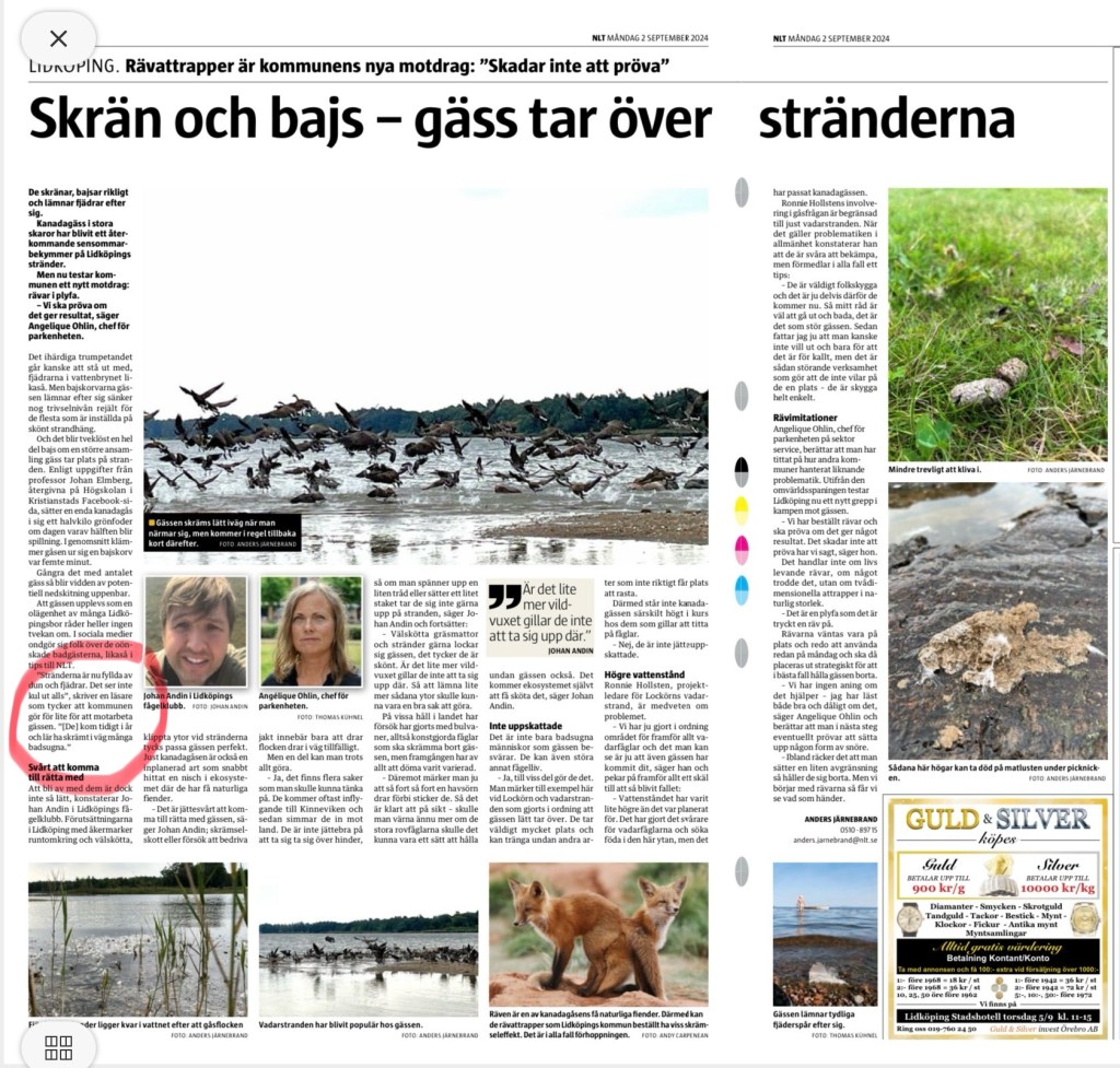 Jag skrev till NLT i förra veckan och bad redaktionen att lyfta problemet med gässen i Kinneviken: Bl.a. ”Stränderna är nu fyllda av dun och fjädrar. Det ser inte kul ut alls. Gässen kom tidigt i år och lär ha skrämt iväg många badsugna”