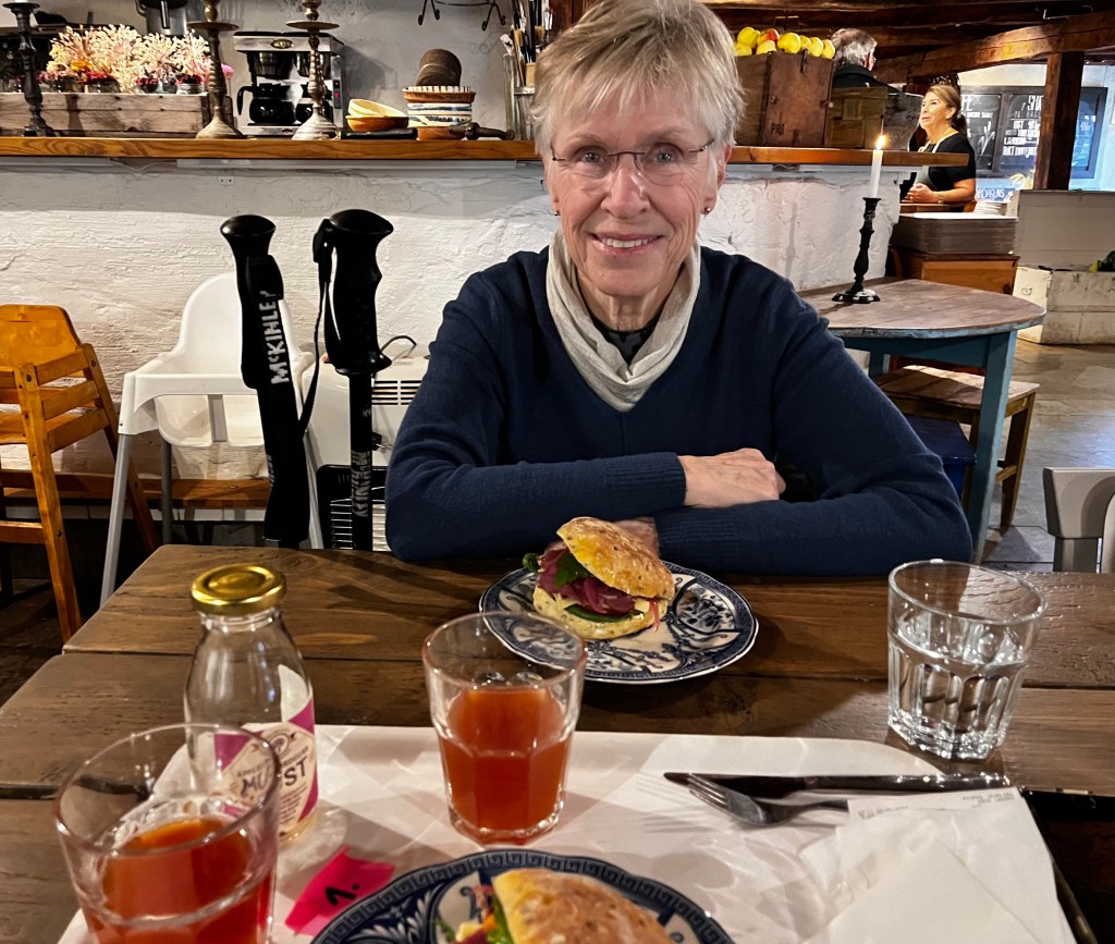 Det är Maria (där i bakgrunden) som alltid gör de oerhört goda mackorna på Klostret, (på bröd som Linus har bakat). Och råvarorna är förstklassiga, som Wrångelbäcksosten från Almnäs Bruk, beläget utanför Hjo.