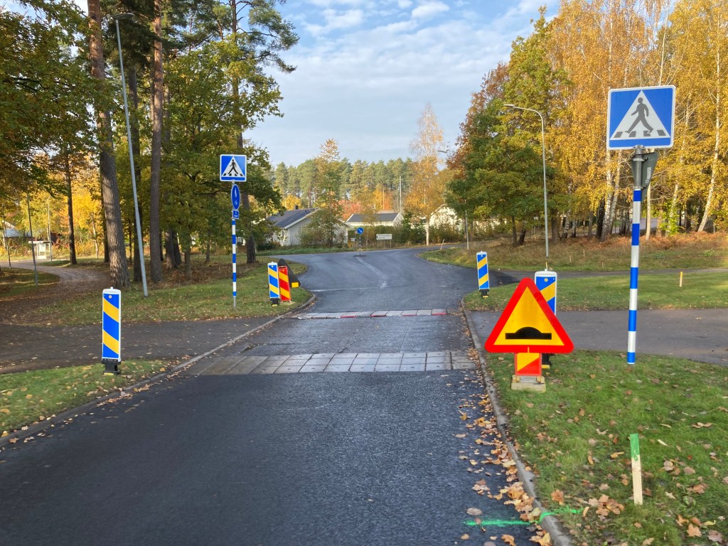 Asfalten i mittsektionen är ännu inte ditlagd, något som gör att det faktiskt kan guppa till inne i bilen. Och sådana hemskheter behöver kommunen tydligen varna för: