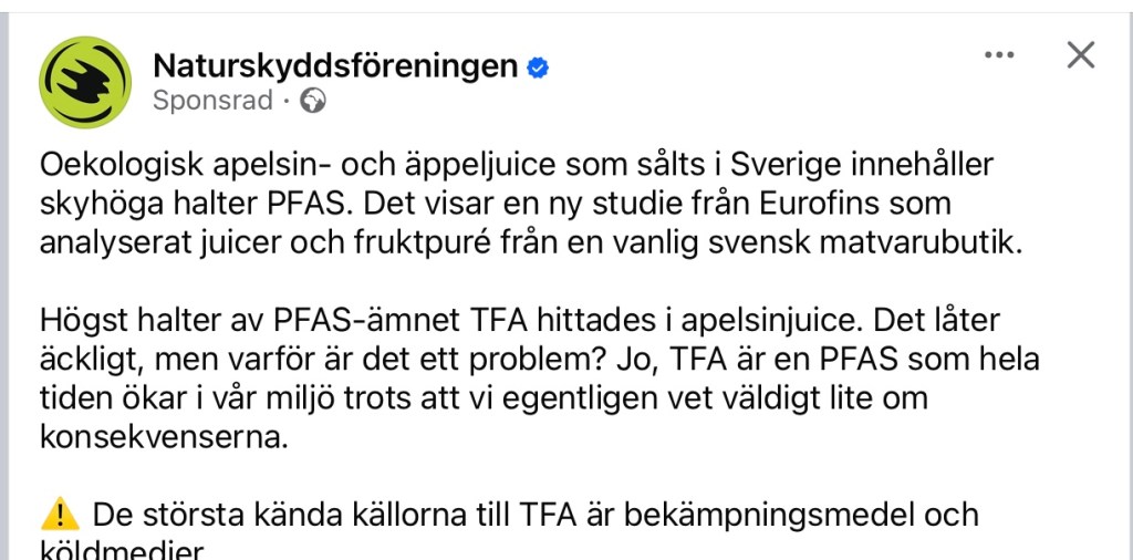 Skyhöga halter av PFAS i oekologisk apelsin- och äppeljuice Screenshot Screenshot Dela det här: Klicka för att dela på X (Öppnas i ett nytt fönster) X Klicka för att dela på Facebook (Öppnas i ett nytt fönster) Facebook Gilla Laddar in … Relaterade