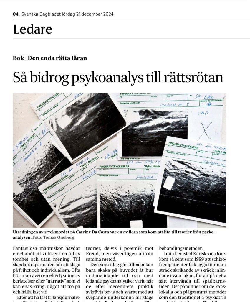 ”Till tragedierna hör förstås också psykoterapins intåg i rättsprocesser. Som domen mot den påstådda seriemördaren Thomas Quick, vars påtända babbel accepterades som erkännanden. Hit hör också en påtagligt kreativ och styrande behandling av barns vittnesmål, betydande för exempelvis utpekandet av två barn för Kevin-mordet och det nu uppmärksammade skuldbeläggandet av allmänläkaren och obducenten för Catrine Da Costas död 1984.