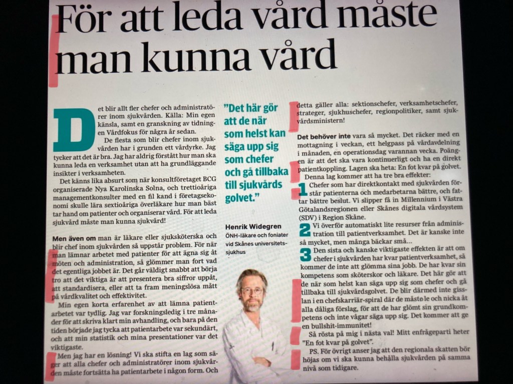 Den var införd den 13/12 och skriven av läkaren Henrik Widegren – ”För att kunna leda vård måste man kunna vård”. Den går inte att läsa utan inloggning men Widegren har lagt ut den på Facebook. De röda strecken står bloggaren för.