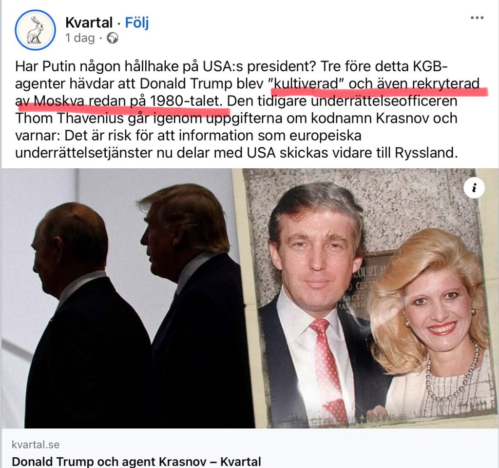En katastrofal kvartalsrapport Den tyder på att Trump kan vara en rysk agent, värvad redan på sovjettiden. Donald Trump ochagent Krasnov Dela det här: Klicka för att dela på X (Öppnas i ett nytt fönster) X Klicka för att dela på Facebook (Öppnas i ett nytt fönster) Facebook Gilla Laddar in … Relaterade
