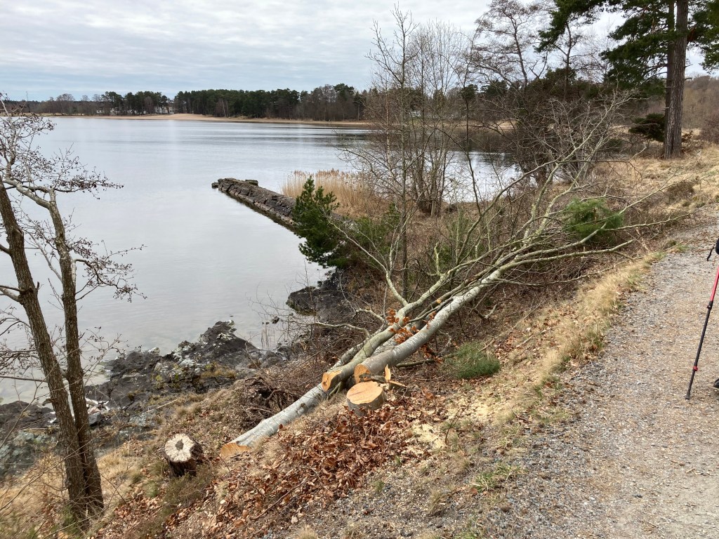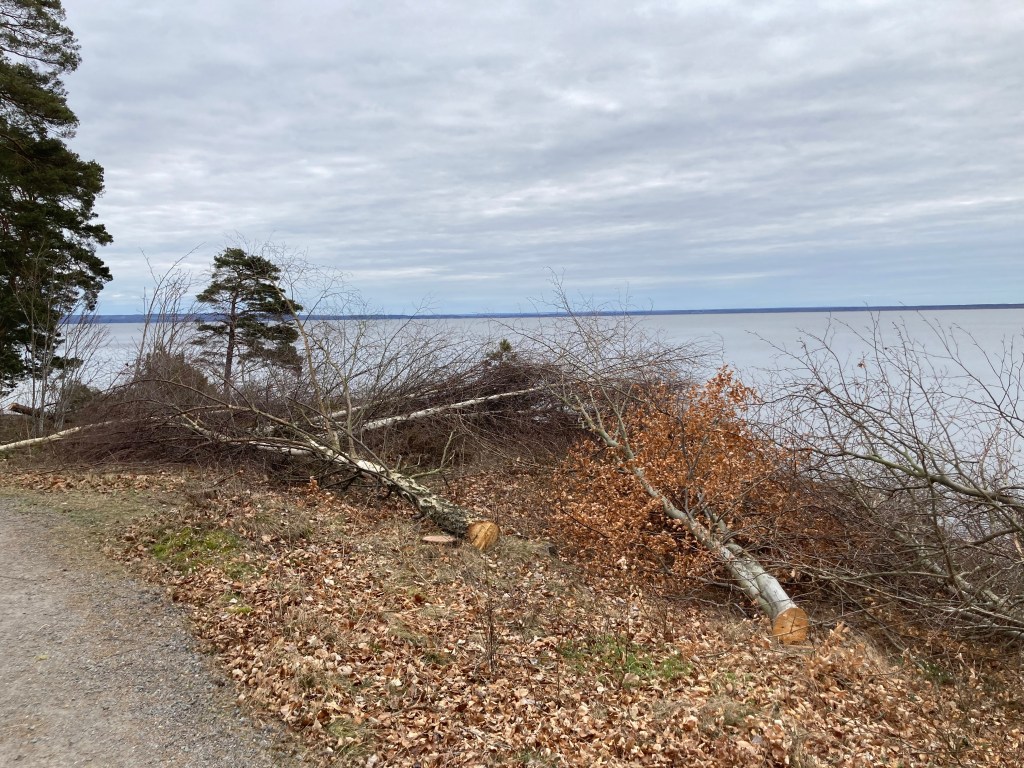 Vi fick en chock vid dagens Strandpromenerande. I närheten av badstegen, alldeles nedanför Vänerblick har kommunen låtit såga ned mängder med tillsynes helt friska träd.