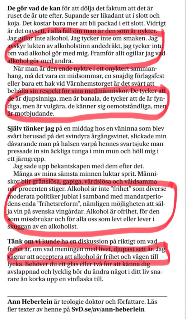 Alkohol är varken frihet eller vägen till lycka Ann Heberlein i onsdagens SvD: https://www.svd.se/a/B0P6de/heberlein-alkohol-ar-inte-frihet-det-ar-vidrigt Dela det här: Klicka för att dela på X (Öppnas i ett nytt fönster) X Klicka för att dela på Facebook (Öppnas i ett nytt fönster) Facebook Gilla Laddar in … Relaterade