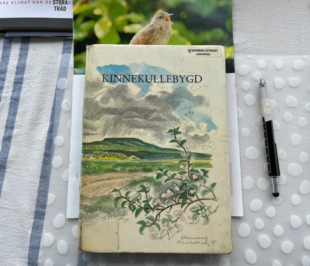 Hur jag än letar kan jag inte hitta boken Kinnekullebygd som vi köpte för dryga 45 år sedan. Men det går bättre på Biblioteket. Först hittar jag ett exemplar i Vg-rummet, men det visar sig vara referenslitteratur. Ett utlåningsbart exemplar saknas, men det finns ett slitet ex. i arkivet som jag lånar hem.