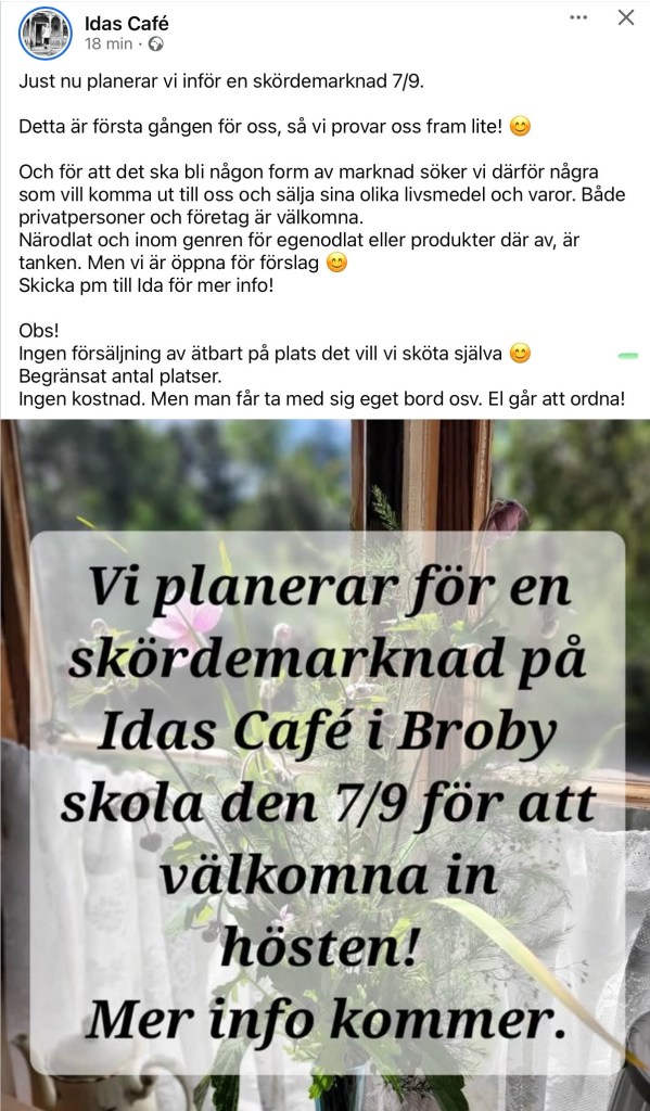 Skördemarknad hos Ida 7/9 Det här vi inte missa: Dela det här: Klicka för att dela på X (Öppnas i ett nytt fönster) X Klicka för att dela på Facebook (Öppnas i ett nytt fönster) Facebook Gilla Laddar in … Relaterade
