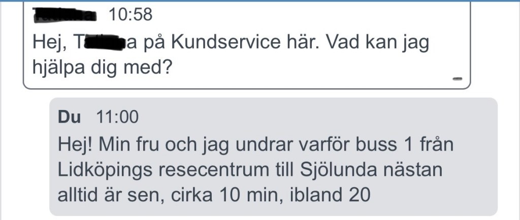 Idag väntade vi på bussen mot Sjölunda vid Framnäs C. Den är alltid försenad, och har varit så sedan tidtabellsskiftet i juni. Förseningen varierar mellan 10 och 20 minuter, detta till stort förtret för väntande resenärer.