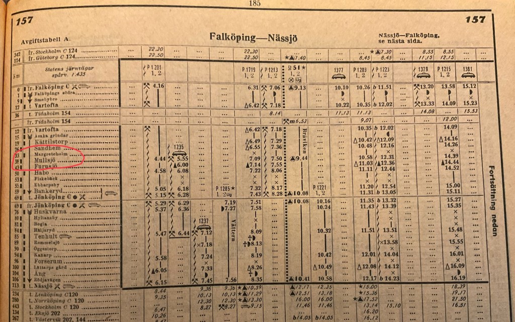Det här är vintertidtabellen 1962. Den årstiden fanns det inte så många tåg som gjorde behovsuppehåll i Margreteholm.