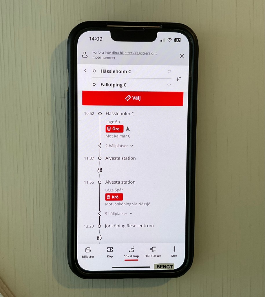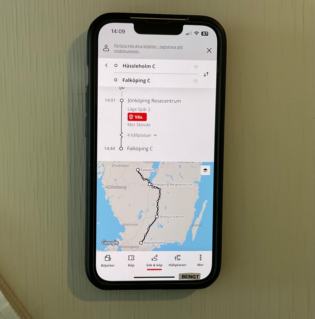 I morgon f.m. skulle det gå på cirka 1.200 kr för oss två att med snabbtåg ta oss från Hässleholm till Falköping, via Nässjö.