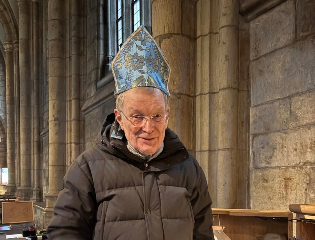 Undertecknad är döpt i Domen (och bodde sina fem första år på Biskop Turgots gata). Nu passade han på att prova barnens mitra (det var tomt i kyrkan, förutom en ihärdig pianostämmare).