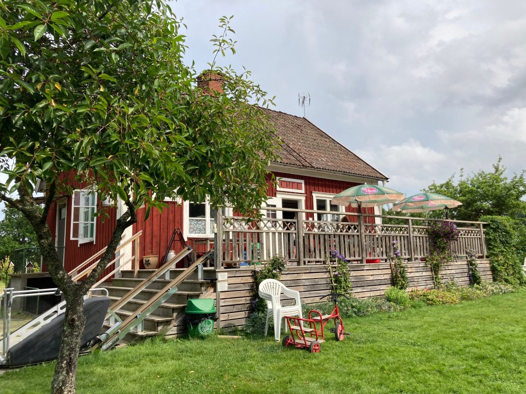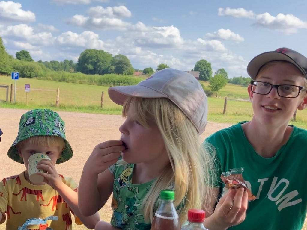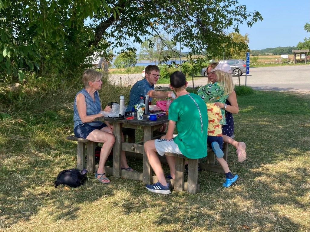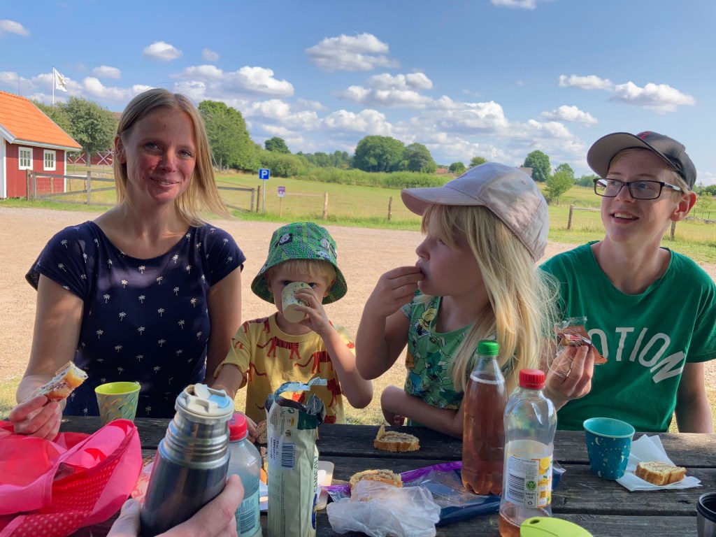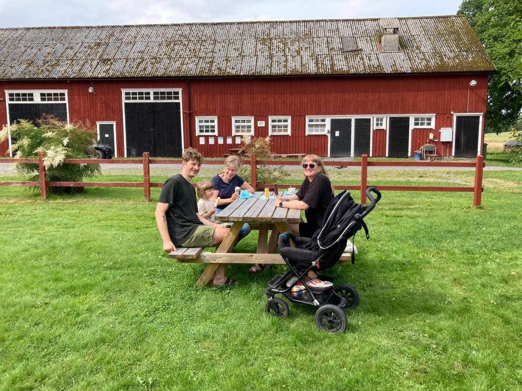 När vi slog oss ned i trädgården på bondgården i Råda mullrade åskan bortanför åsen, men vi höll oss kalla (dvs oförskräckta) med hjälp av glass.