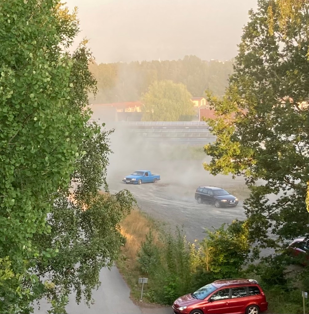Även ikväll är det lekstuga på Lidens parkering. Minst fyra så kallade EPA-traktorer har sladdat runt. Ett av fordonet var av en sådan där jättelik typ som hantverkare brukar ha för att få plats med riktigt mycket utrustning.