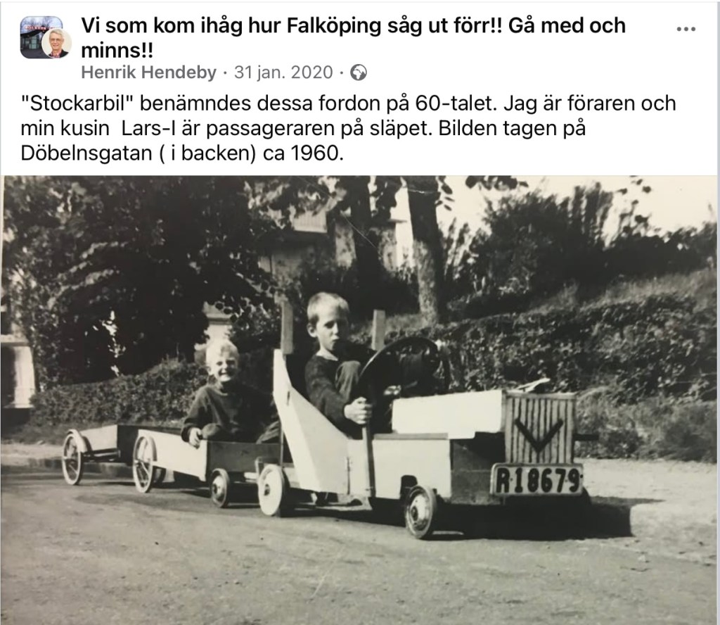 I början av 1960-talet sa vi alltid stockarbil om lådbilar, åtminstone i metropolen Falköping. Jag gör en sökning på Google, och får en enda träff. Inlägget har gjorts på Facebook av min klasskamrat från gymnasiet. Det var han och jag som åkte till Ytongfabriken (hade vi tänkt på att mäta radonhalten kunde vi ha stoppat tillverkningen av blåbetong!!) och till parkeringshusen i Göteborg – för att mäta luftföroreningar. Far hans körde bussen mellan Falköping och Skara (och var kommen från Händene, därav efternamnet). Vägen var på den tiden krokig och smal, men fadern körde i en hiskelig fart, även när vägbanan var täckt med snö.