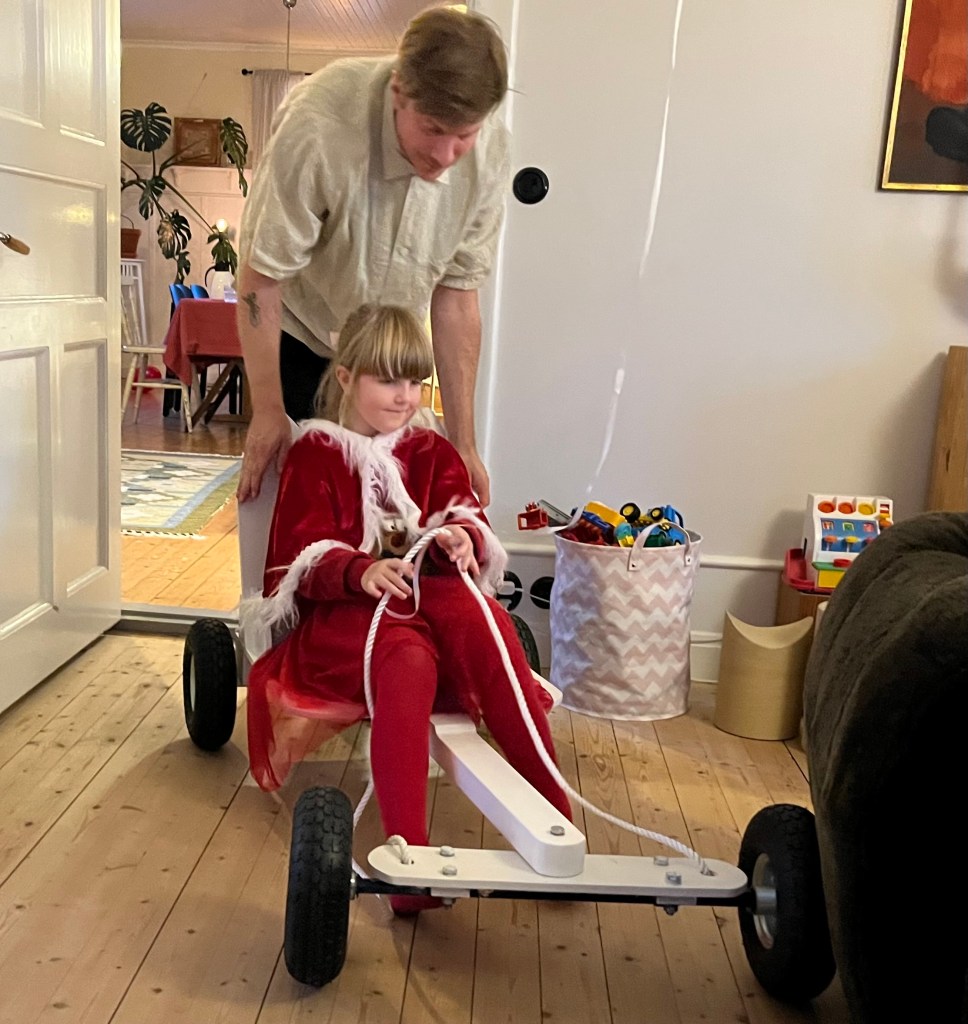 Som en (av flera) presenter igår fick Majlis en av hennes far tillverkad lådbil, med hjul från Jula. Och den bilen går inte av för hackor, eller vad säger ni😊